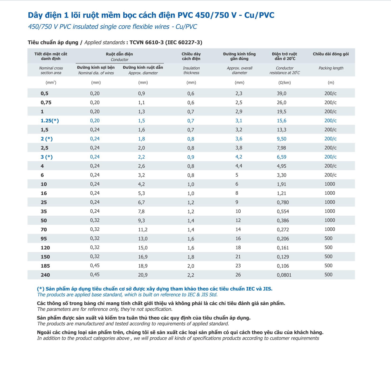 Dây điện 1 lõi ruột mềm bọc cách điện PVC 450/750V - Cu/PVC thuộc sản phẩm dây điện dân dụng.