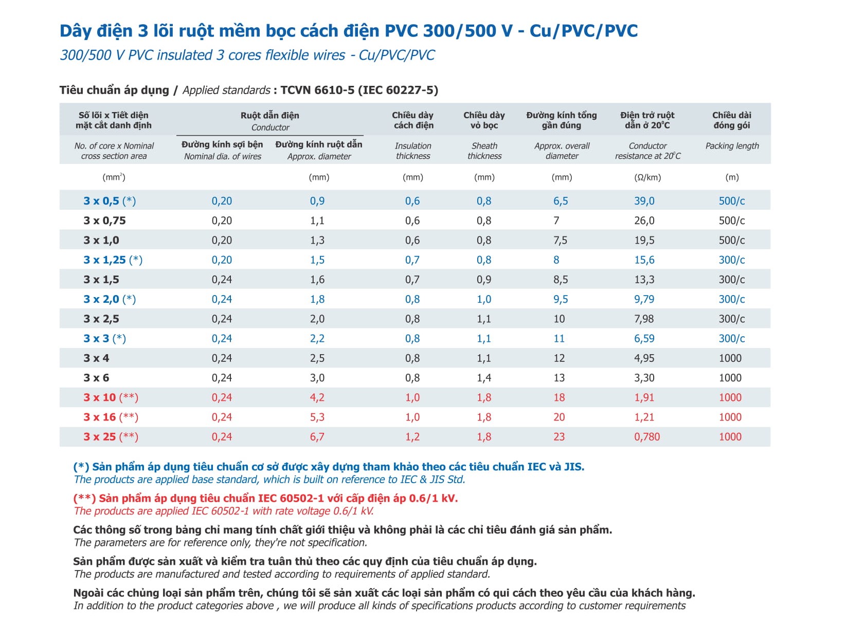 Dây điện 3 lõi ruột mềm bọc cách điện PVC 300/500V - Cu/PVC/PVC thuộc sản phẩm dây điện dân dụng.