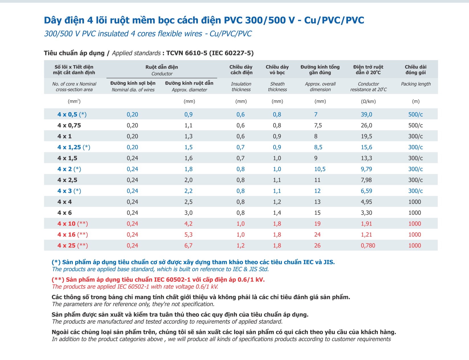 Dây điện 4 lõi ruột mềm bọc cách điện PVC 300/500V - Cu/PVC/PVC thuộc sản phẩm dây điện dân dụng.