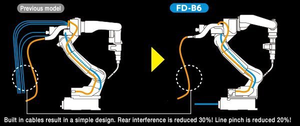 - Dễ sử dụng: Các loại cáp hàn, cáp tín hiệu và ống dẫn khí đã được đưa vào trong thân máy, giúp cho robot dễ sử dụng hơn và linh hoạt hơn.